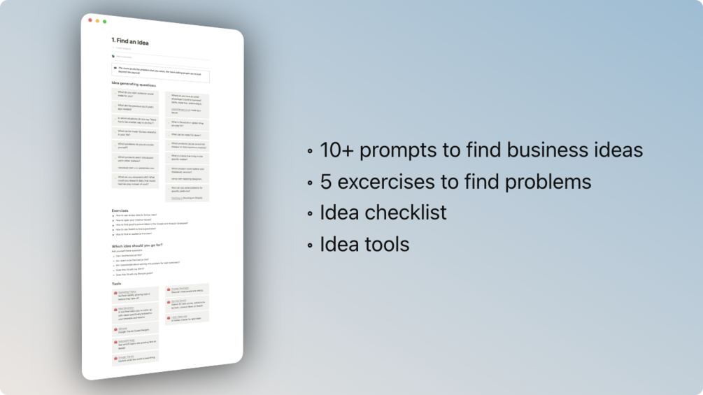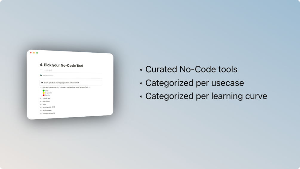 With No-Code, anyone can build their idea. But starting to build a product people want and launching is still challenging, and there are many traps on the way. That's why I created this actionable workbook to help you with 6 clear and actionable steps to go from idea to first product made with No-Code.