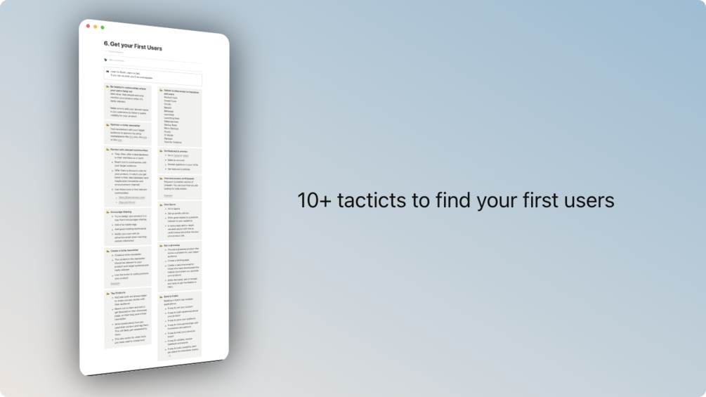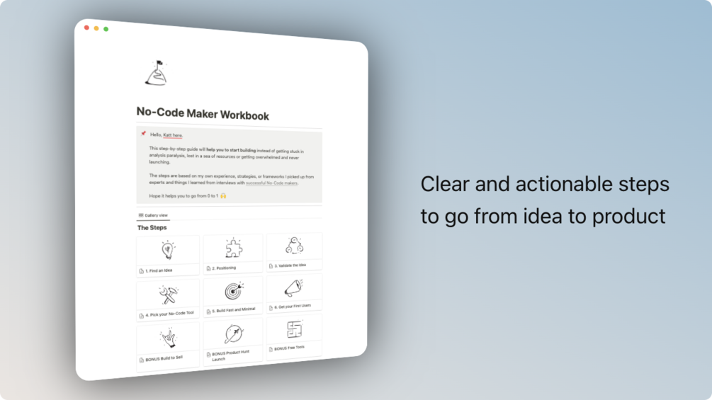 With No-Code, anyone can build their idea. But starting to build a product people want and launching is still challenging, and there are many traps on the way. That's why I created this actionable workbook to help you with 6 clear and actionable steps to go from idea to first product made with No-Code.